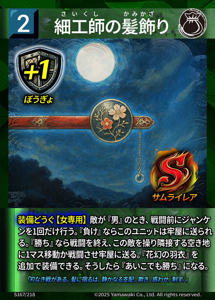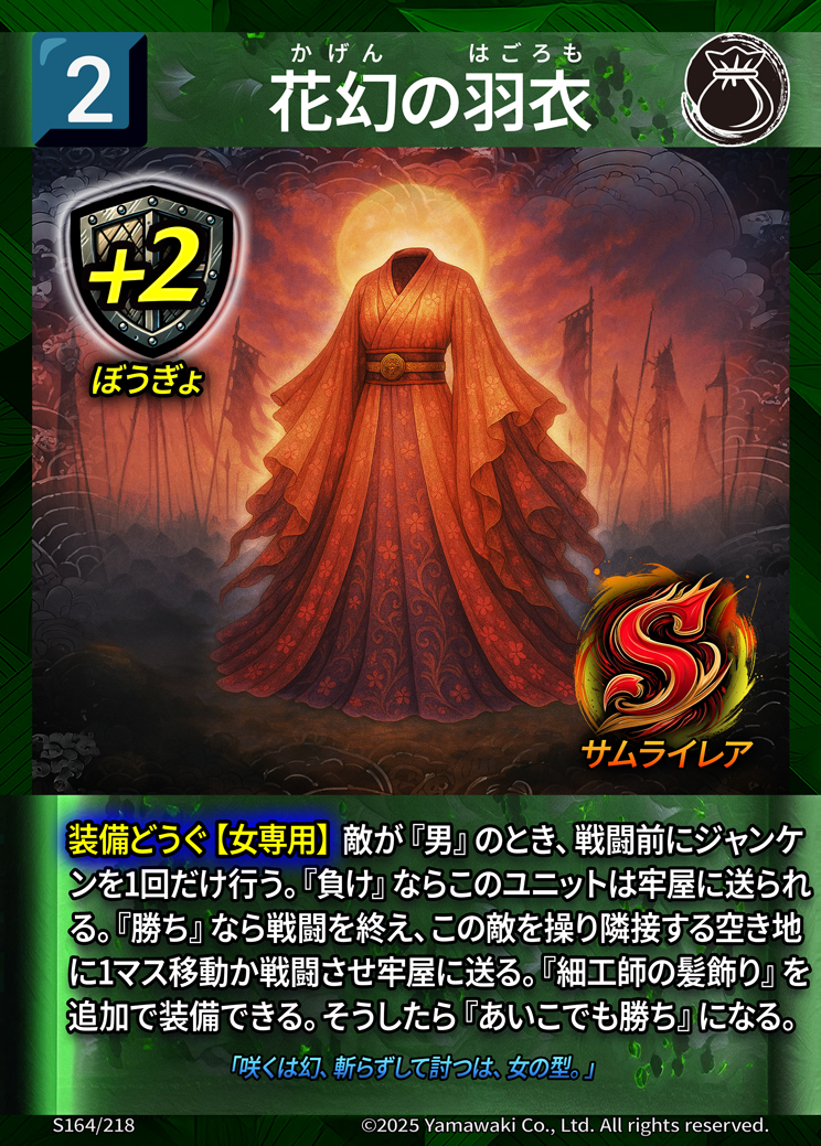 例えば、「花幻の羽衣」を装備している女の平民が、男である「宮本武蔵」に成ると、装備どうぐは外れてしまします。